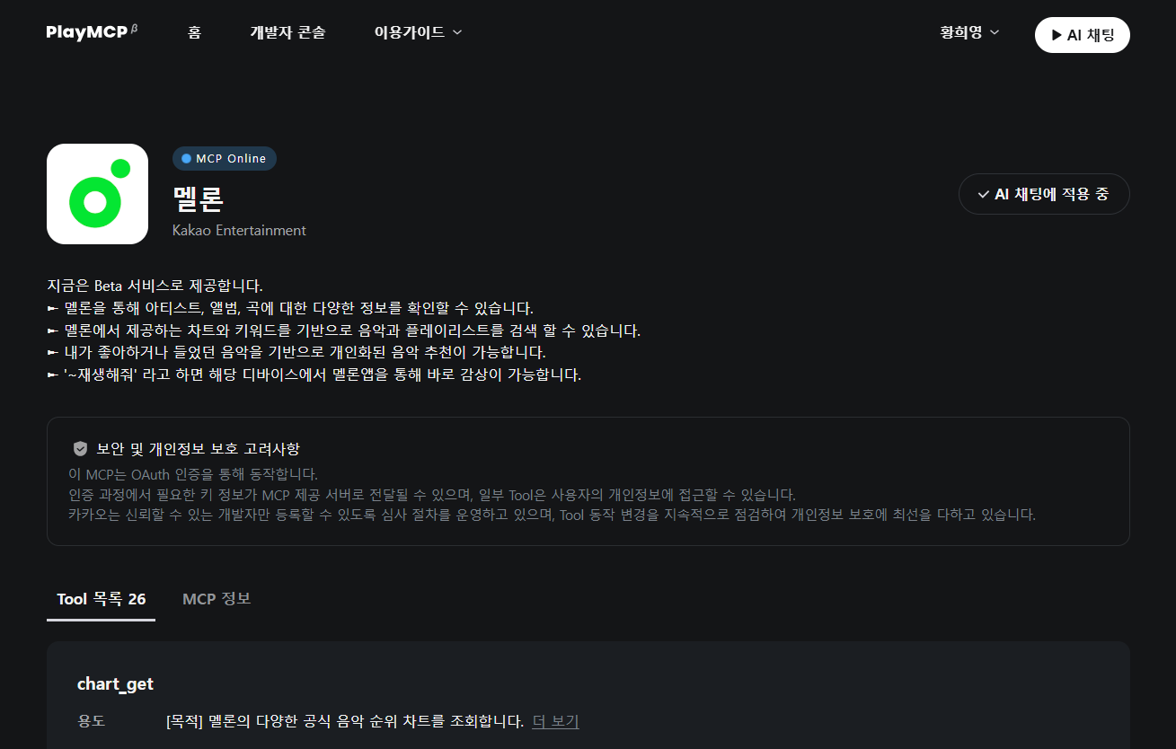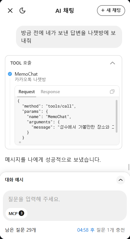 적용한 MCP 서버를 해당 플랫폼에 통합된 AI 채팅창(GPT-4o 기반)에서 써볼 수 있습니다.