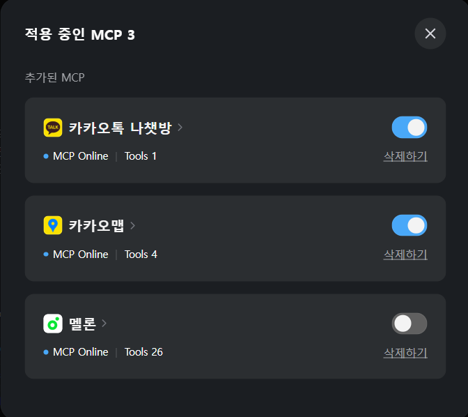 AI 채팅창에서는 적용 중인 MCP를 확인할 수 있고, on/off를 설정할 수 있습니다.