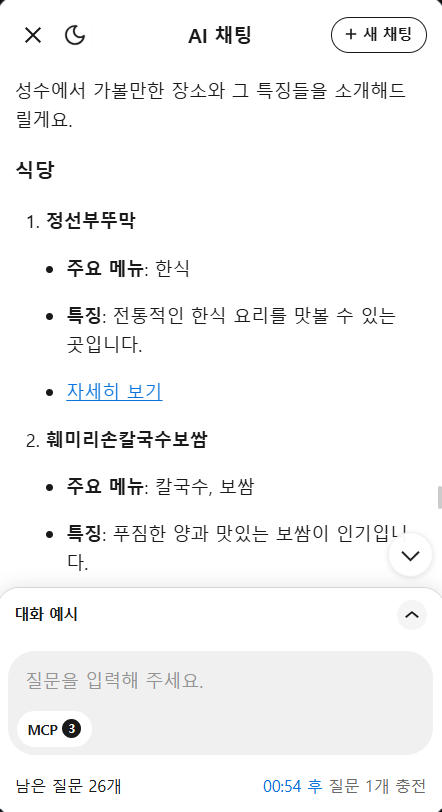 MCP를 사용하니 환각 없이 지도상의 정보들을 기반으로, 실제 존재하는 식당들을 추천해준 점은 만족스러웠으나